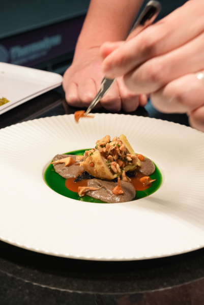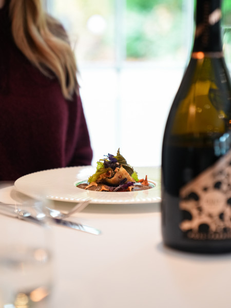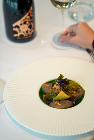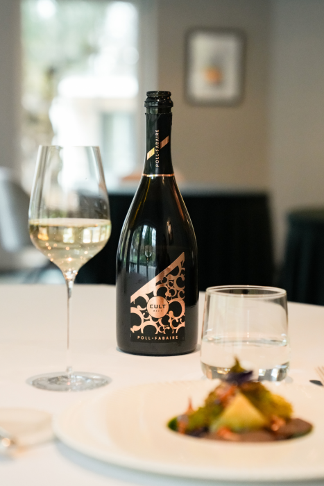 Zu diesem besonderen Moment wurde unser Crémant POLL-FABAIRE Cult ausgewählt. Aus Pinot Noir Blanc de Noir hergestellt und mindestens 24 Monate auf der Hefe gereift, entfaltet er in der Nase Finesse und Eleganz mit zarten Noten roter Früchte. Am Gaumen zeigt er sich raffiniert, fruchtig und von anhaltender Struktur – die perfekte Ergänzung zur Feinsinnigkeit und Frische der Gerichte des Kochs.